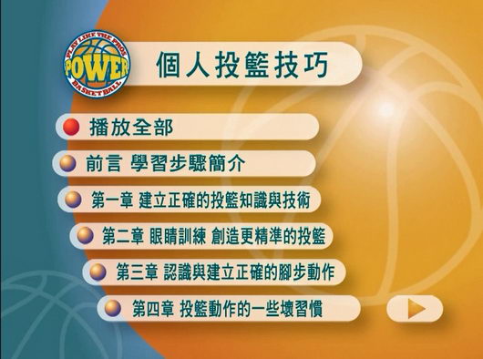 Power basketball 強力籃球 個人投籃技巧 (建立正確的投籃知識與技術 眼睛訓練 創造更精準的投籃 認識與建立正確的腳步動作 投籃動作的一些壞習慣 投籃時機 強化投籃技巧的一些特別建議 一些錯誤的投籃觀念 我們建議的投籃練習方法) 中文教學版(DVD一片裝)